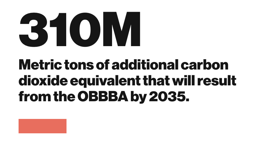 The provisions repealed and rolled-back from the Inflation Reduction Act in the OBBBA were designed to help the United States get on a track to meet pollution-reduction targets to prevent the worst impacts of climate change. Now, the consequences of the OBBBA will increase greenhouse gas emissions by nearly 310 million metric tons of carbon dioxide equivalent in 2035, increasing risks associated with climate change such as wildfires and hurricanes. From worker safety in extreme heat, to rising rates of preventable injuries and violence due to climate change, to the increasing severity of threats to the electric grid, the setbacks that the OBBBA will enshrine for the climate risks Americans’ safety and livelihoods.