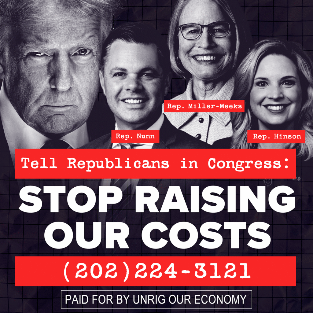 “Today’s event featuring President Trump and Representatives Miller-Meeks, Nunn, and Hinson is a charade to distract from the higher costs they have inflicted on Iowans,” said Unrig Our Economy Campaign Director Leor Tal. “From voting to cut Medicaid and SNAP to ending vital health care tax credits to implementing cost-raising tariffs, President Trump and Republicans in Congress have spent the past year raising costs on working families, while giving tax breaks to millionaires and billionaires. We’re circling this event with this mobile billboard to show President Trump and Republicans in Congress like Miller-Meeks, Nunn, and Hinson that they can neither run nor hide from their record of consistently putting the wants of the ultra-rich over the need of working families.”