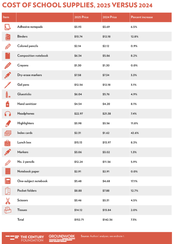 New analysis by Groundwork Collaborative and The Century Foundation finds that a typical assortment of first-day school supplies will cost an average of 7.3 percent more this back-to-school season—nearly three times headline inflation over the past year. Price increases for some supplies like index cards have jumped more than 40 percent, and binders and folders will run parents 13 percent more this back-to-school shopping season.