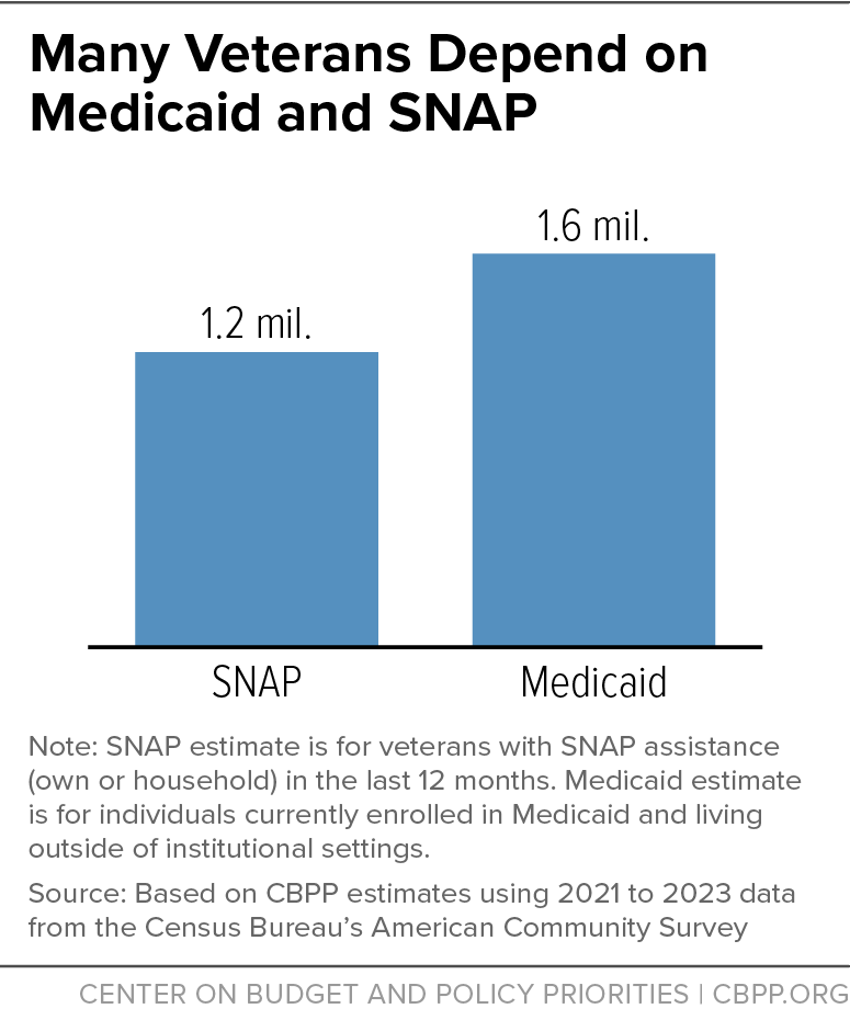 House Republicans’ budget reconciliation legislation would take away health coverage and food assistance from many millions of people, including veterans. One out of every four veterans lived in a household receiving food assistance from the Supplemental Nutrition Assistance Program (SNAP) or health coverage from Medicaid or Children’s Health Insurance Program (CHIP) at some point in 2023.